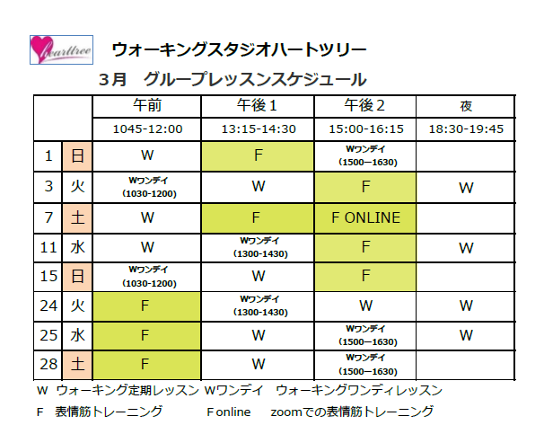 2026年3月 スタジオハートツリー グループレッスンスケジュール